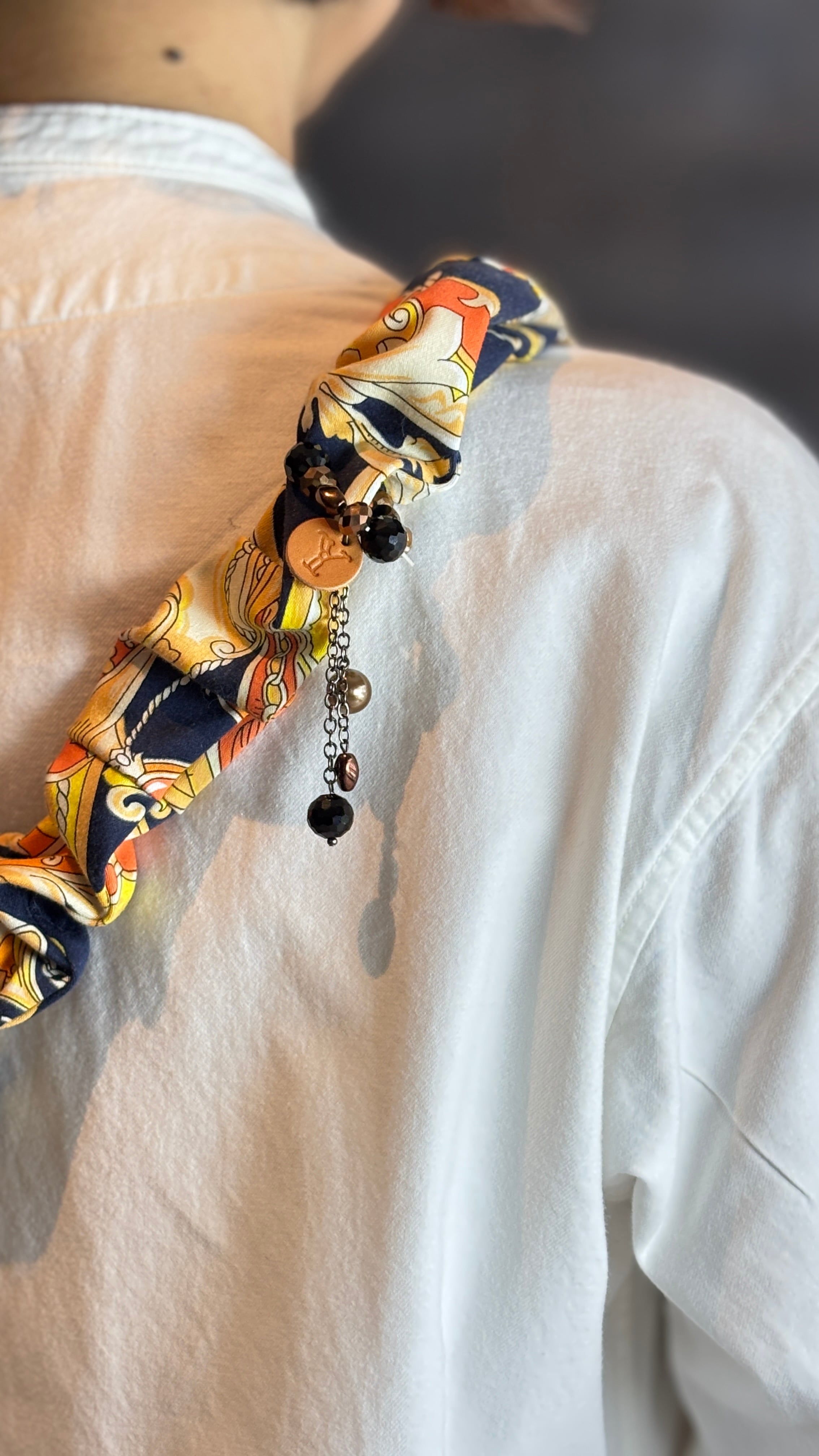 ベースカラーはシックなネイビーと華やかでエレガントな柄の組み合わせ